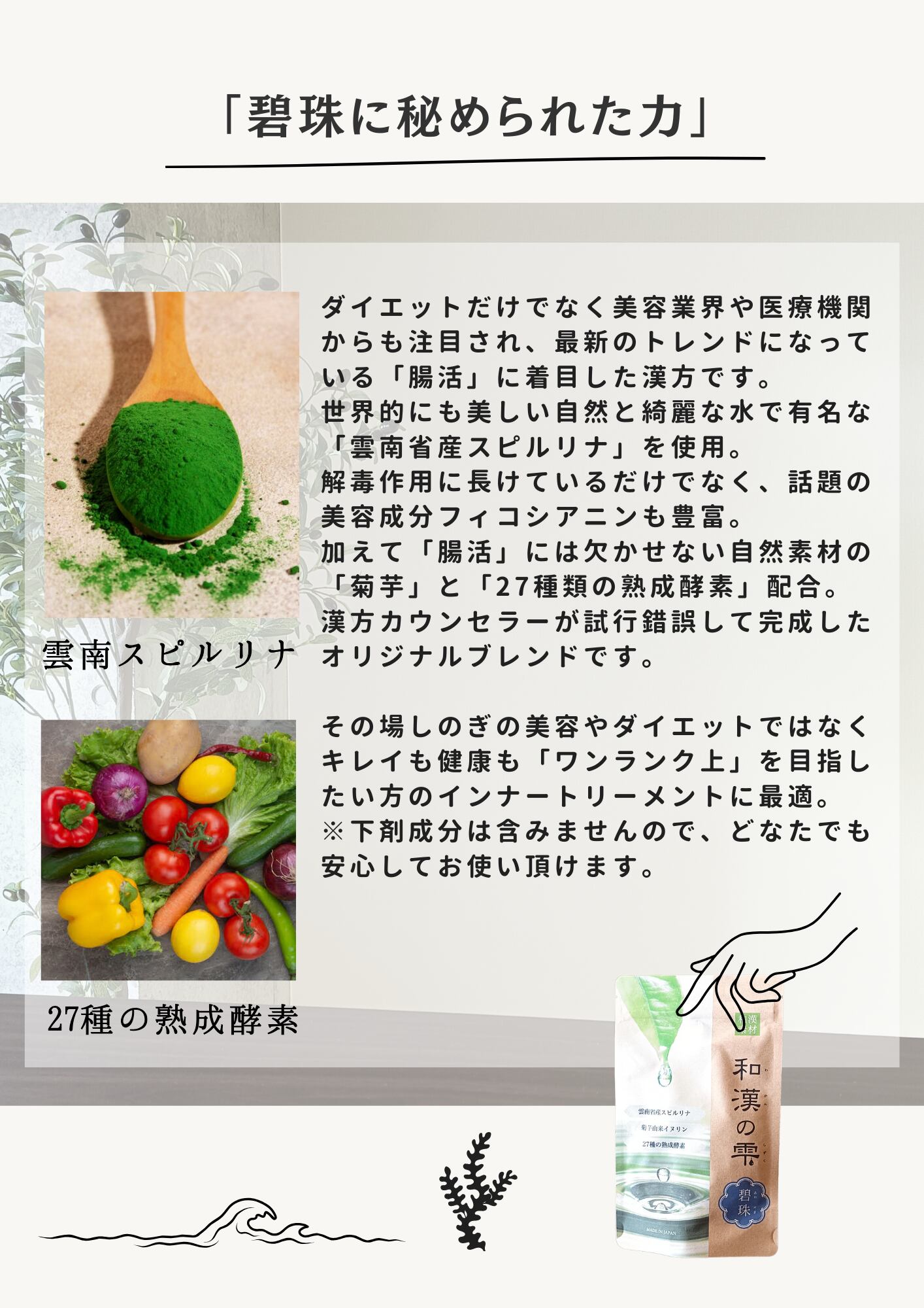 ▶解毒作用に長けているだけでなく、話題の美容成分フィコシアニンも豊富に含んでいます。